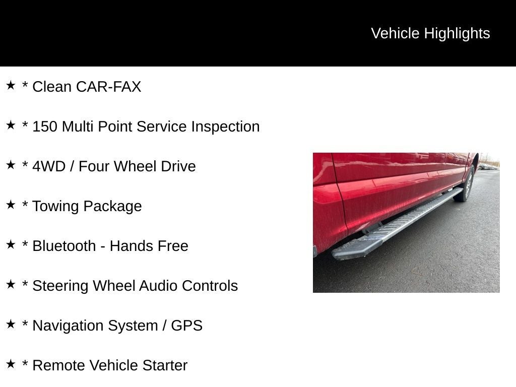 * Clean CAR-FAX, * 150 Multi Point Service Inspection, * 4WD / Four Wheel Drive, * Towing Package, * Bluetooth® - Hands Free, * Steering Wheel Audio Controls, * Navigation System / GPS, * Remote Vehicle Starter, * Rear Backup Camera, * Power Drivers Seat, * Heated Seats, * Sirius XM Radio, * Premium Wheels, * Tonneau Cover, F-150 XLT, 4WD.
