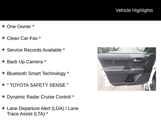 One Owner *, Clean Car-Fax *, Service Records Available *, Back Up Camera *, Bluetooth® Smart Technology *, TOYOTA SAFETY SENSE , Dynamic Radar Cruise Control *, Lane Departure Alert (LDA) / Lane Trace Assist (LTA) *, Pre-Collision System (PCS) w/Pedestrian Detection *, Automatic High Beams *, 6 Speakers, ABS brakes, Alloy wheels, AM/FM radio: SiriusXM, Apple CarPlay/Android Auto, Auto-dimming Rear-View mirror, Automatic temperature control, Dual front impact airbags, Dual front side impact airbags, Front dual zone A/C, Front fog lights, Garage door transmitter: HomeLink, Heated door mirrors, Illuminated entry, Power door mirrors, Power driver seat, Power Sliding Rear Window w/Privacy Glass, Remote keyless entry, Security system, TRD Off Road Package.